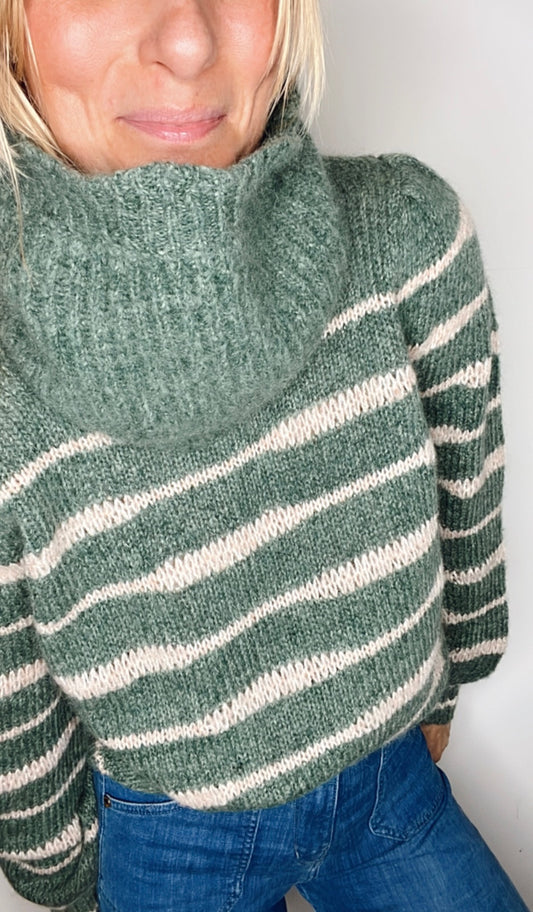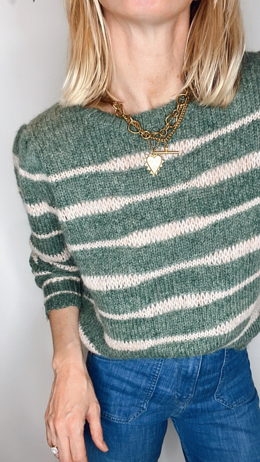 Irregular Stripe Chunky Knit Jumper - Forest Green & Blossom