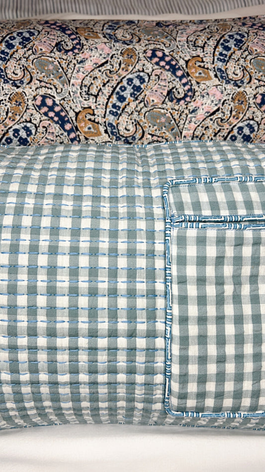 Oscar Gingham Pocket Quilted Cushion Cover - Denim Blue