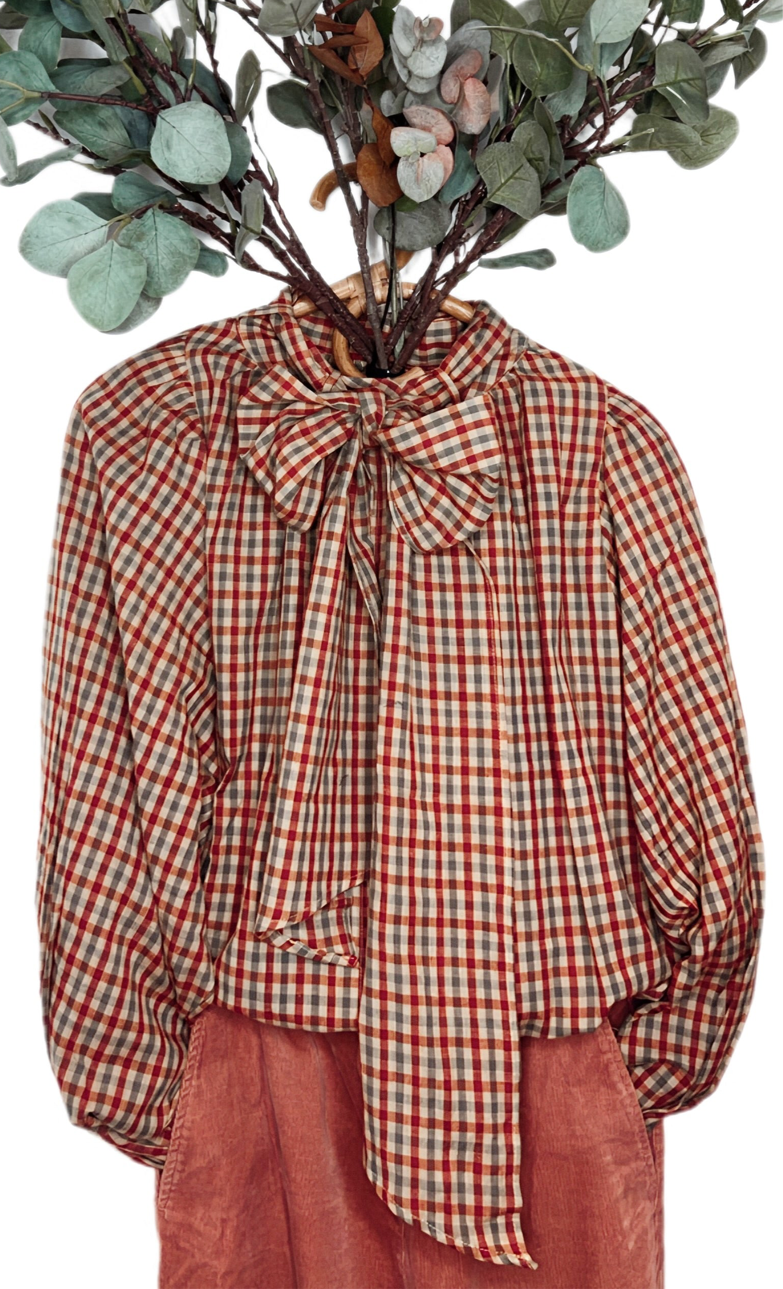 Autumn Gingham Detachable Tie Neck Cotton Shirt - Merlot Multi