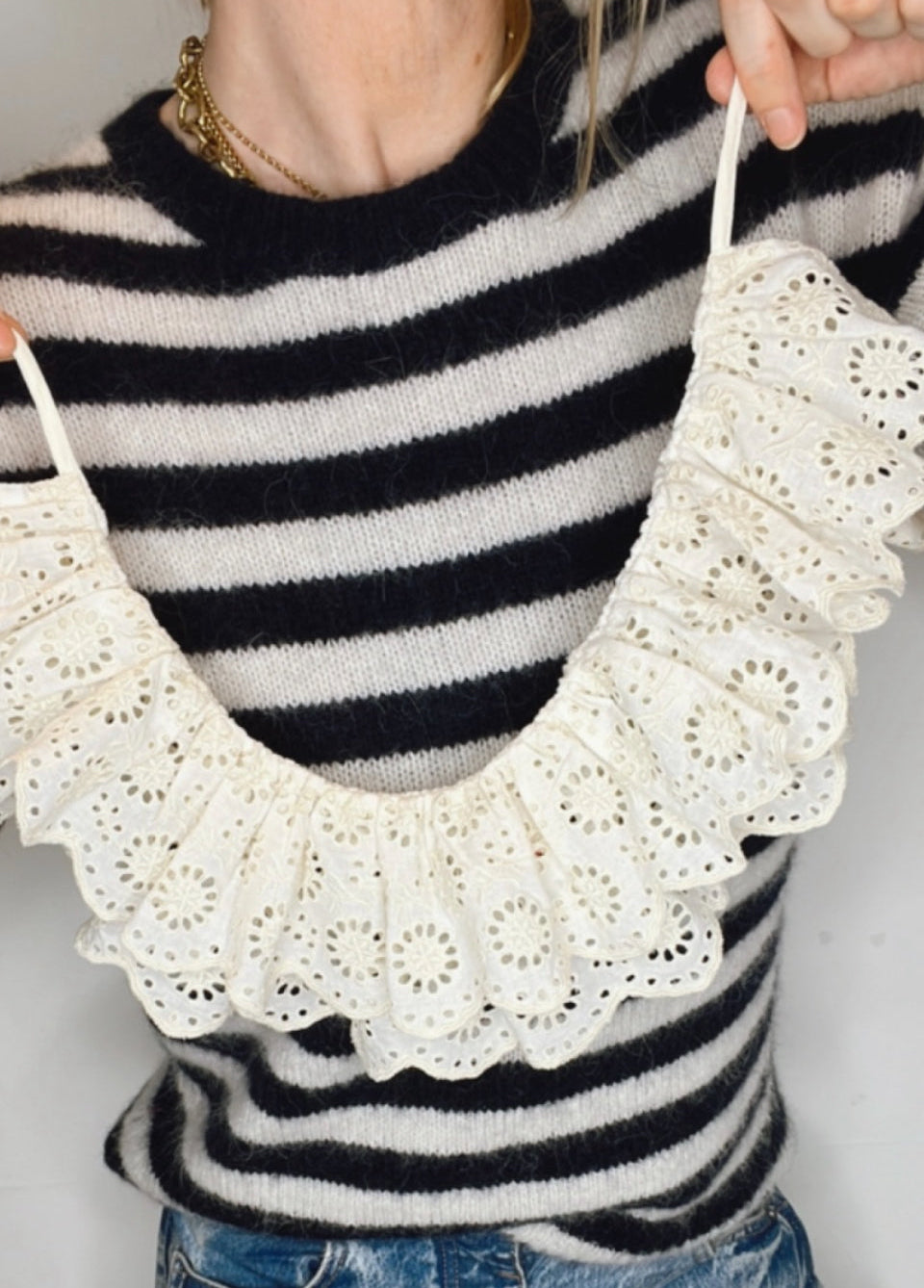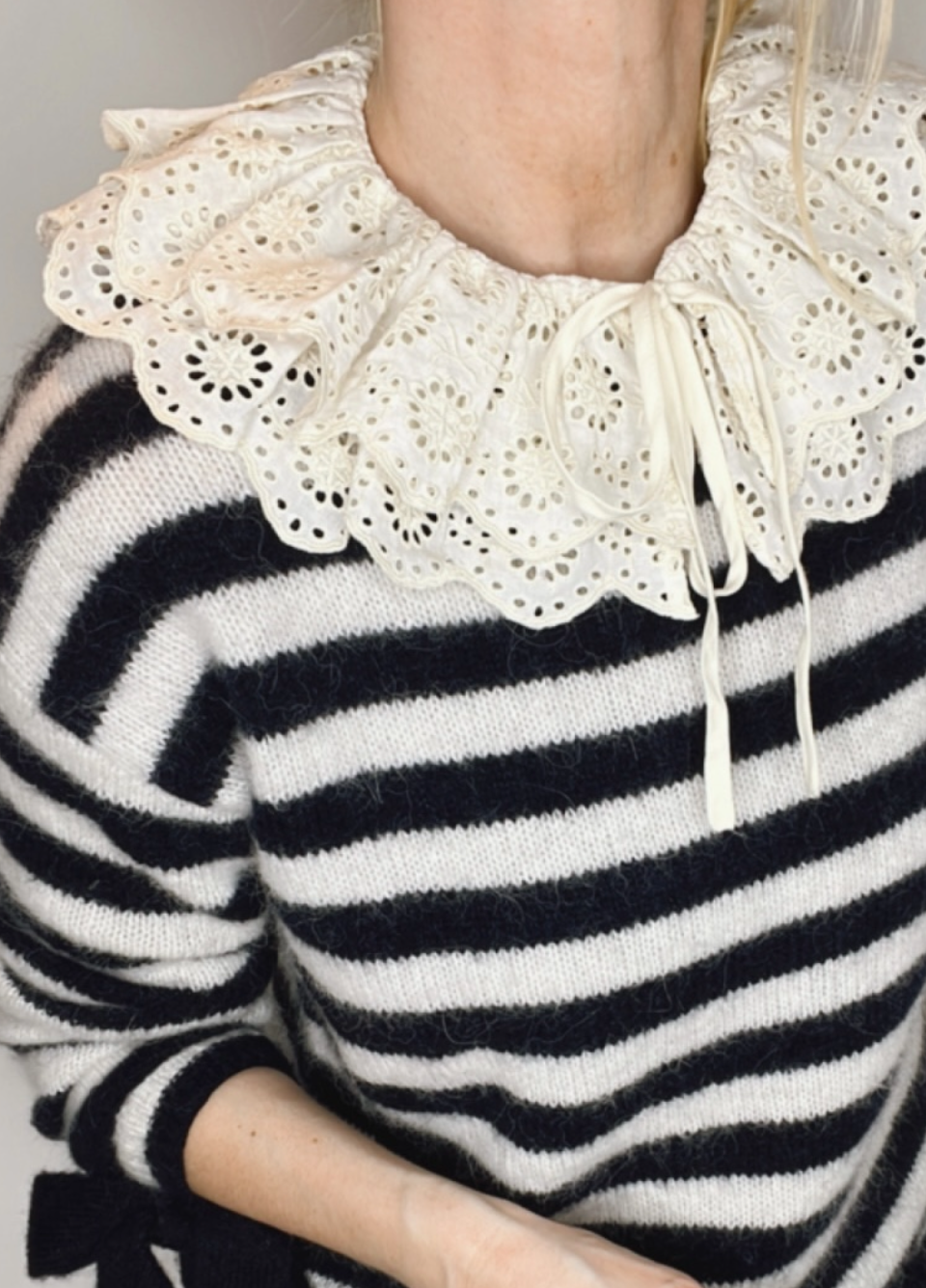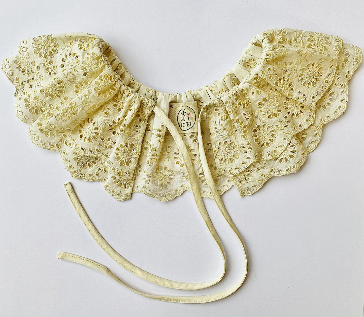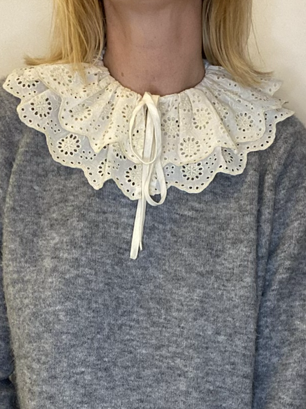 Our best selling Cloudia is finally back in stock! This beautiful double layered, scalloped edge, broderie anglaise fabric has been created in to this completely unique, one of a kind, softly gathered collar with a narrow tie fastening. Wear with the tie to the front or to the back, or try tucking the bottom layer in to your top or dress to create a distinctive look and brighten up your everyday outfits.