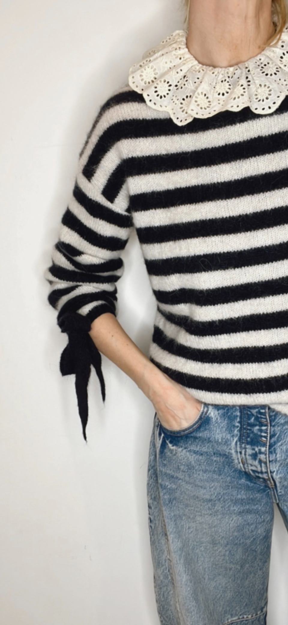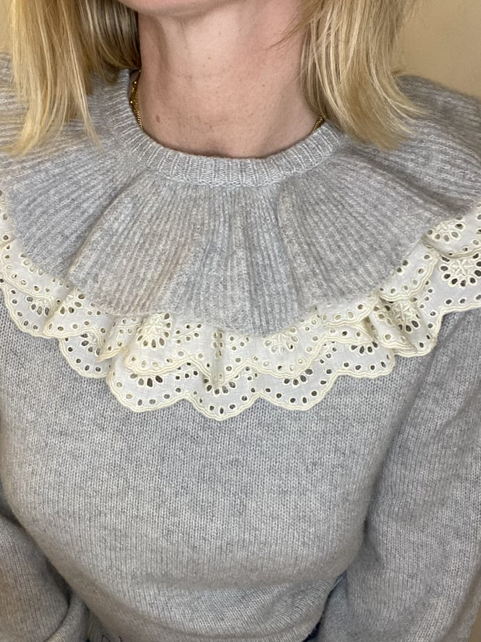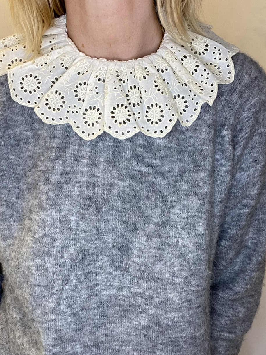 Our best selling Cloudia is finally back in stock! This beautiful double layered, scalloped edge, broderie anglaise fabric has been created in to this completely unique, one of a kind, softly gathered collar with a narrow tie fastening. Wear with the tie to the front or to the back, or try tucking the bottom layer in to your top or dress to create a distinctive look and brighten up your everyday outfits.