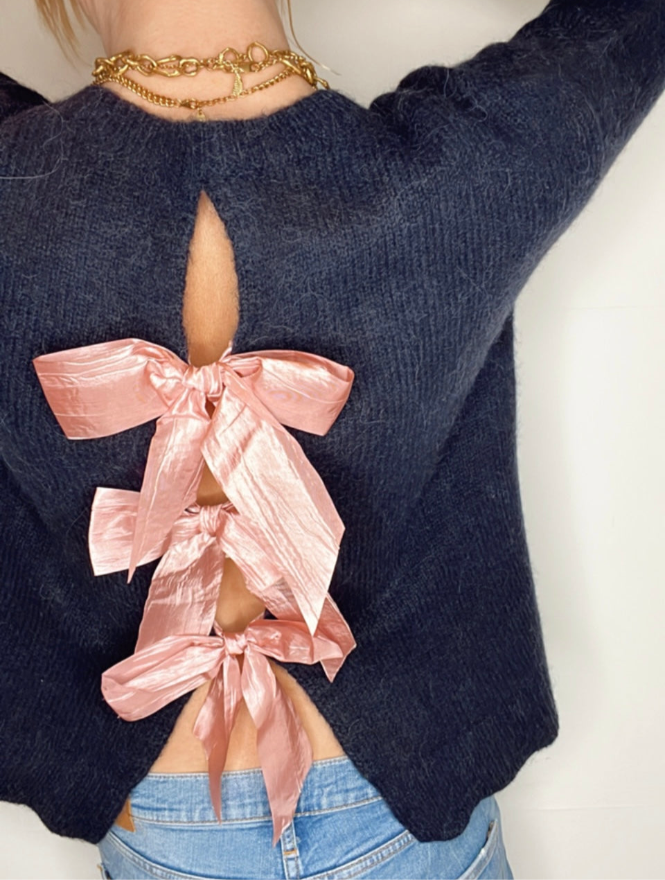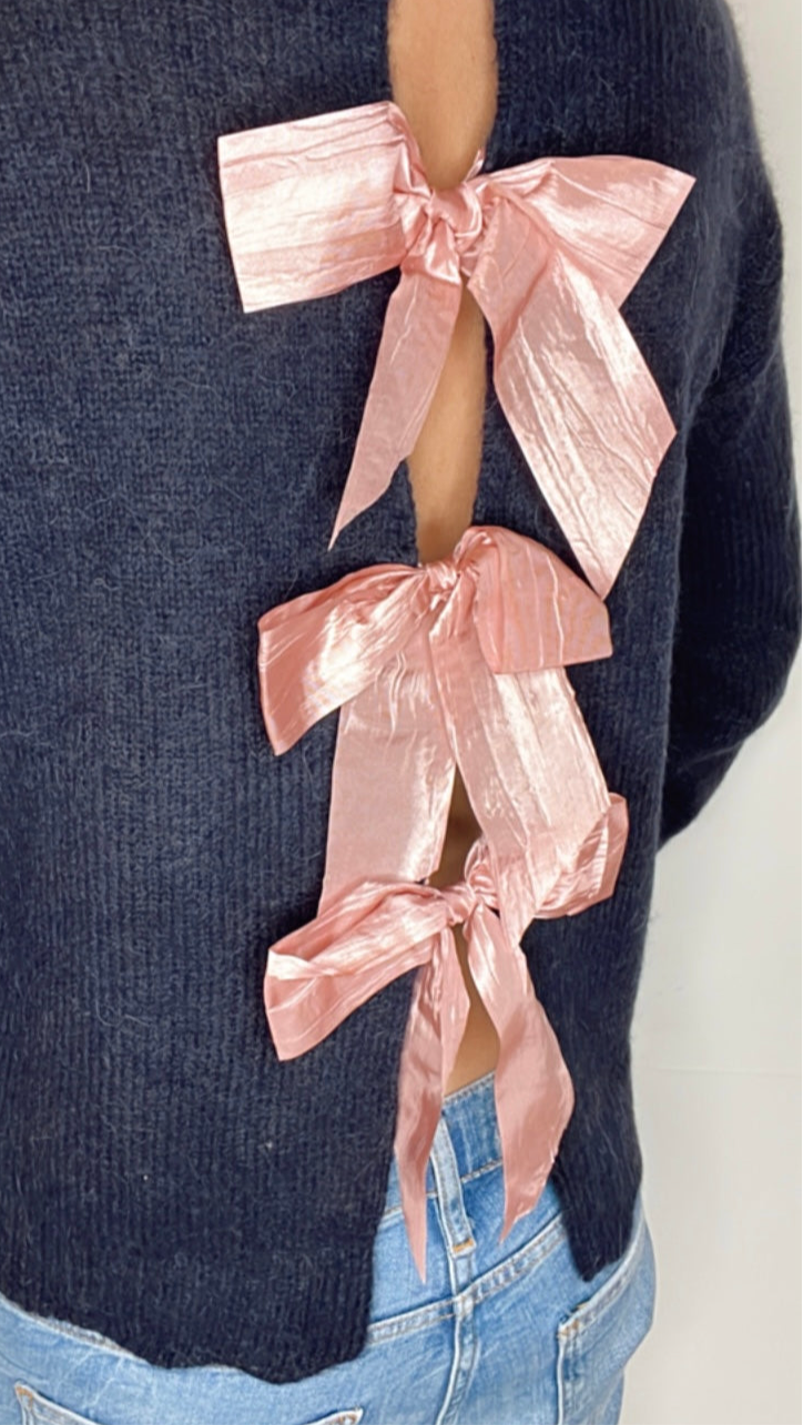 - A classic, super dark navy, dyed with non-toxic dyes and paired with silky ties at the back in a perfect, plaster pink!