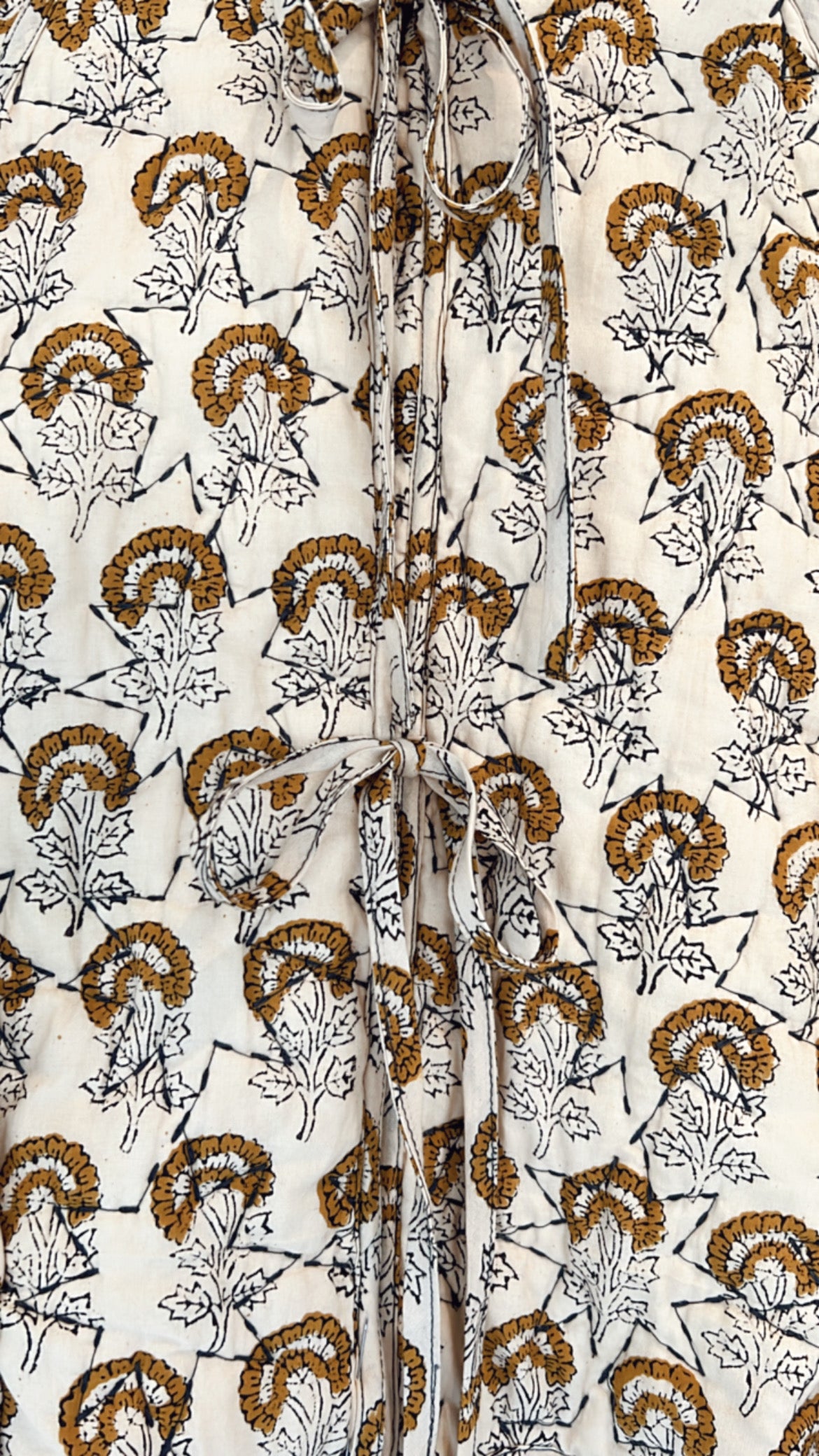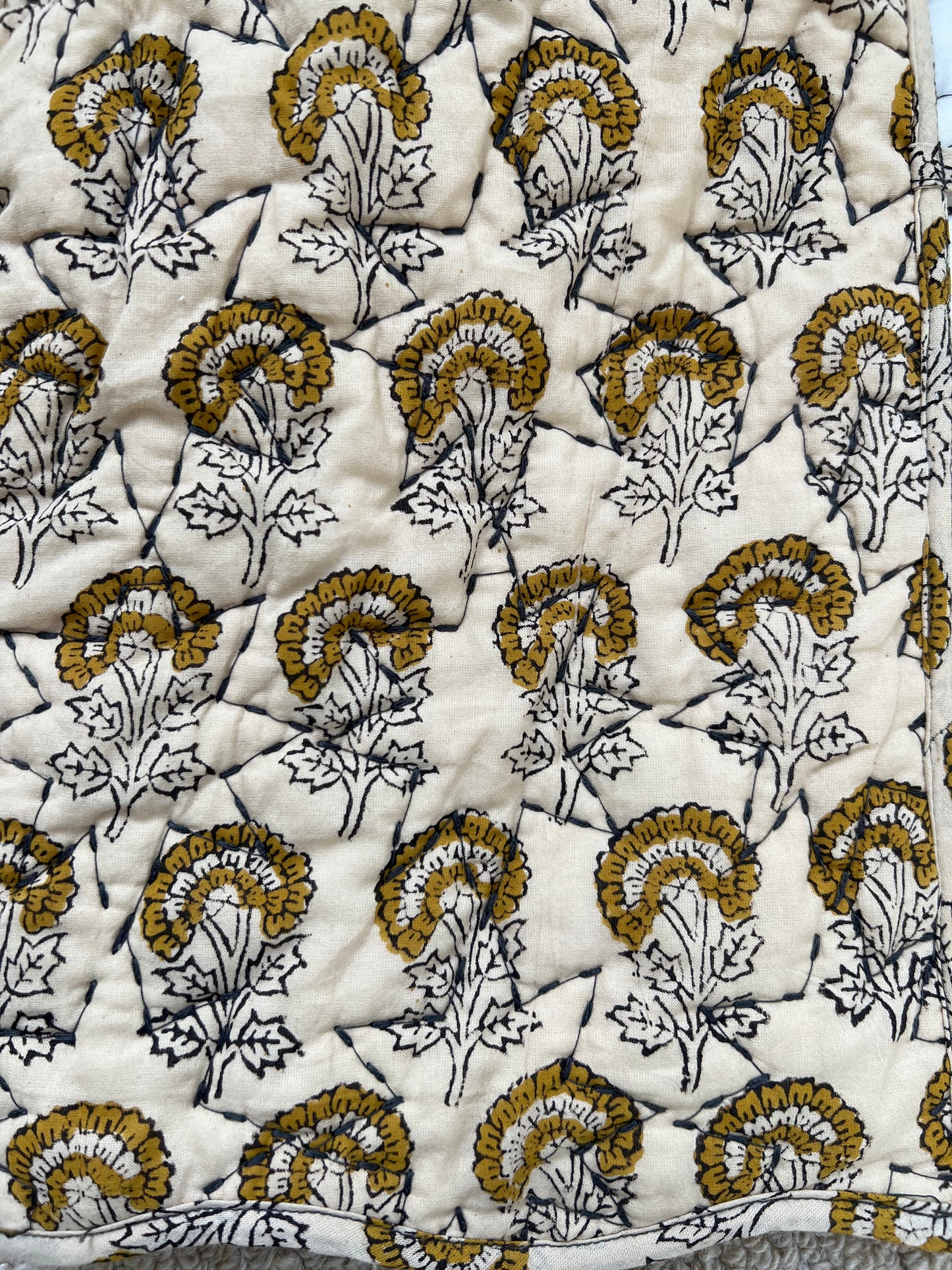 - A neutral base with handprinted woodblock flowers in charcoal and a khaki/mustard - so beautiful!