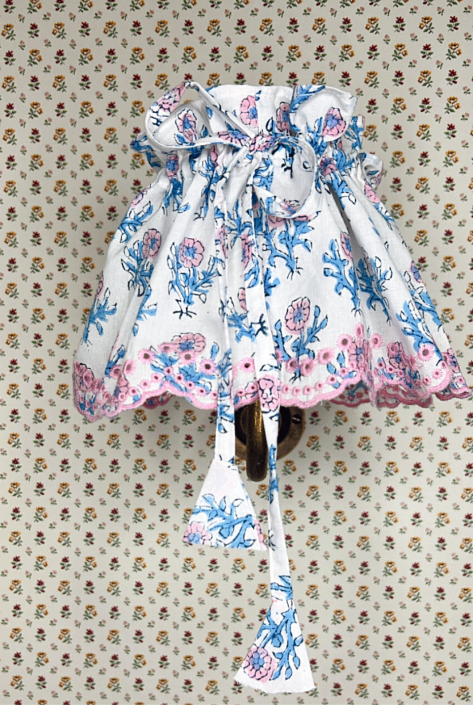 Small Adjustable Broderie Trim Fabric Lampshade Cover - Light Teal & Dusty Rose